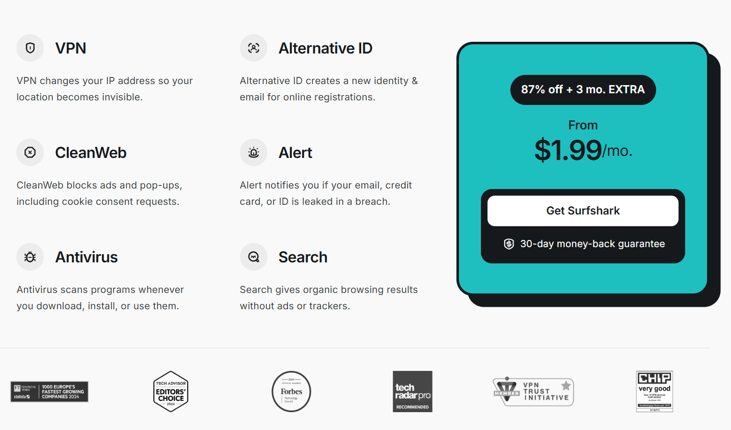 *Prices shown are illustrative — update to match your current Surfshark deal. 30-day money-back guarantee applies.